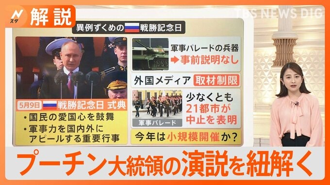 9日、ロシアでは戦勝記念日の軍事パレードが行われ、プーチン大統領が演説をしました。プーチン大統領の演説からどのような現状が読み取れるのでしょうか。解説です。日比麻音子キャスター:そもそも戦勝記念日の式…