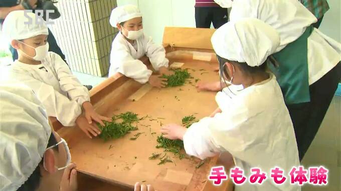 収穫したお茶の葉はおよそ20キロで、子どもたちは、下から熱を加える台の上で収穫した茶葉の「手もみ」も体験しました。