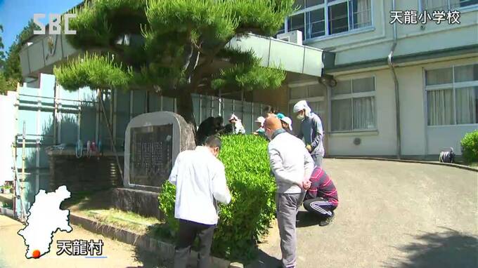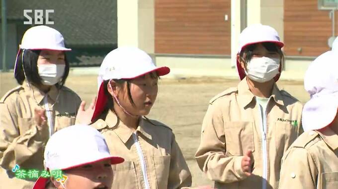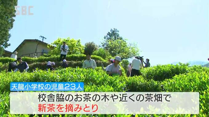 天龍小学校の全校児童23人が10日、校舎の脇に植えられたお茶の木や、近くの茶畑で新茶を摘みとりました。