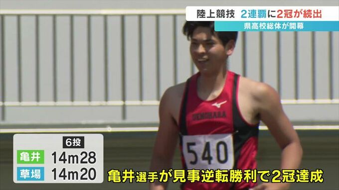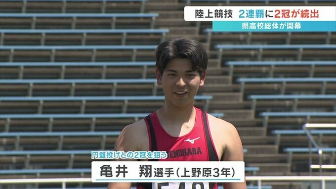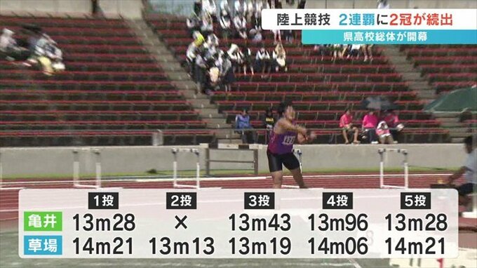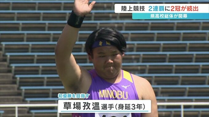 男子の砲丸投げは、初優勝を目指す身延高校3年 草場孜温選手と、去年優勝し円盤投げとの2冠を狙う上野原高校3年 亀井翔選手の一騎打ちとなりました。