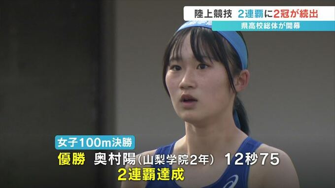 女子100m決勝は、山梨学院の2年 奥村陽選手が駿台甲府の2年 岩間彩芽選手とのライバル対決を制し、この種目2連覇達成です。