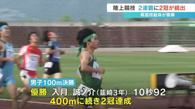 男子100m決勝は、スタートで飛び出した韮崎の3年 入月誠ノ介選手が後半も加速してそのままゴールし、400mと合わせて2冠に輝きました。