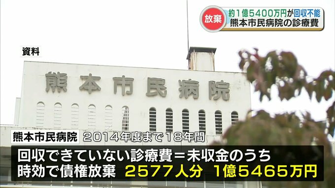 熊本市病院局によりますと熊本市民病院の回収できていない診療費=未収金のうち、時効を迎え債権放棄したのは、2014年度までの18年間に診療を受けた2577人分、1億5465万円です。