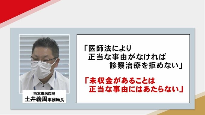 熊本市病院局の土井義周 事務局長によると「医師法により正当な事由がなければ診察治療を拒めない」「未収金があるということは正当な事由にはあたらない」ということです。