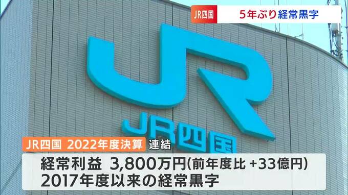 JR四国は、2022年度のグループ全体の連結決算で、経常利益が2017年度以来の黒字となったことを明らかにしました。保有する土地を売却したことなどが増収の理由としています。一方、本業の鉄道事業では営業損失が約1…