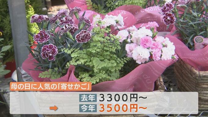 一方で、物価高の影響で花の仕入れ値は高騰。カーネーションや、ラベンダーなど寄せ植えができる苗が入った母の日に人気の「寄せかご」も、去年は3300円からの販売でしたが今年は3500円からと値上げすることになりました。