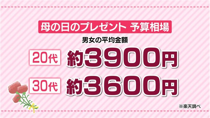 インターネット・ショッピングモール、楽天市場の調査によりますと、母の日に関連する商品の売上データを基に算出した20代男女の平均金額は約3900円。30代は約3600円。統計では30代よりも20代のほうがお金をかけていることがわかりました。みなさんはどんなものをプレゼントするのか?