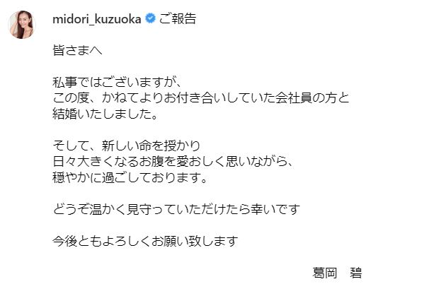 葛岡さんは「この度、かねてよりお付き合いしていた会社員の方と結婚いたしました」と記し、合わせて「新しい命を授かり 日々大きくなるお腹を愛おしく思いながら、穏やかに過ごしております」と綴っています。