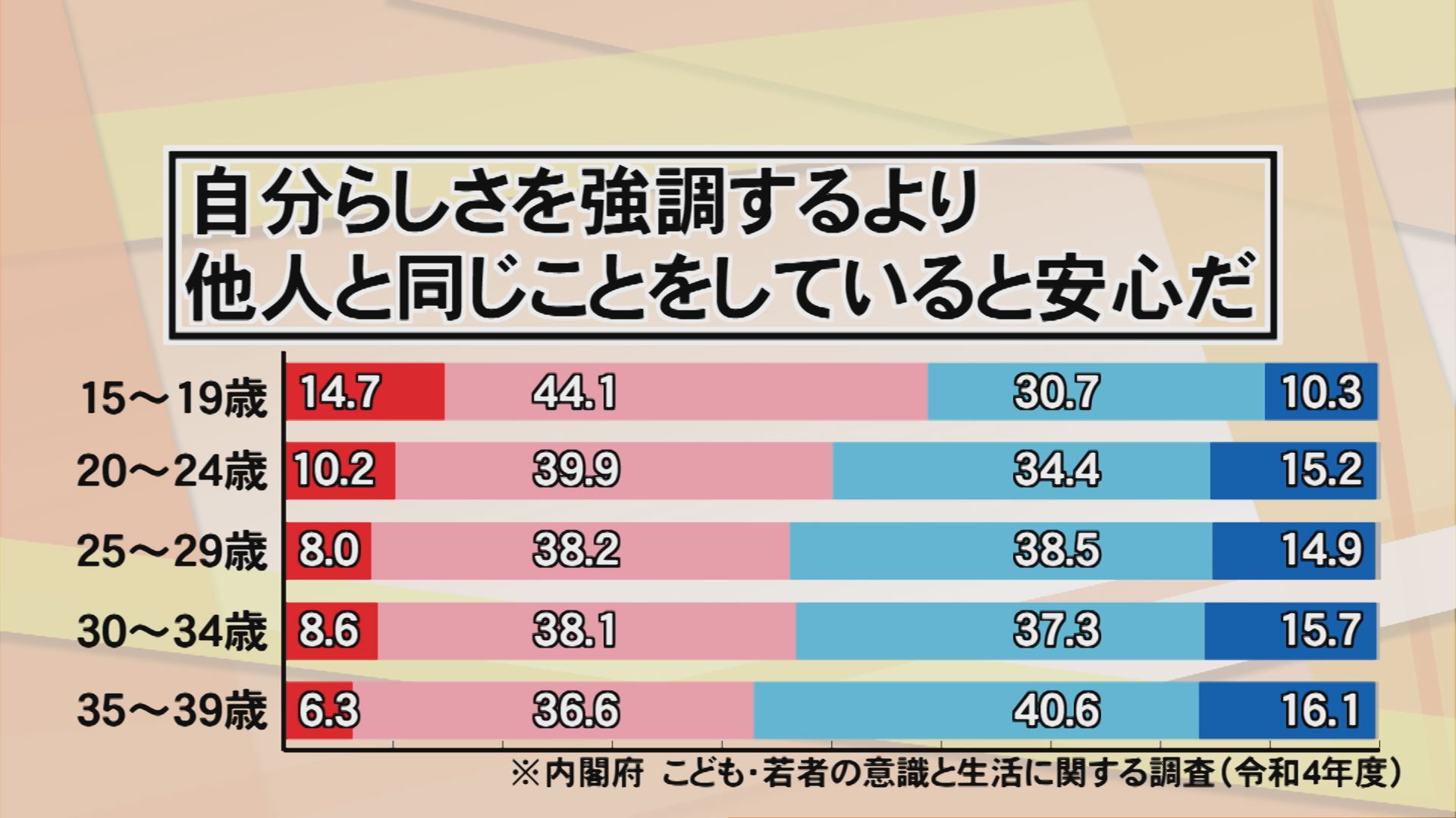 内閣府が行った意識調査の結果では、「いまの自分が好きか」という質問では、15~19歳の63%が「あてはまる」「どちらかといえばあてはまる」と回答している一方、「自分らしさを強調するより、他人と同じことをしていると安心だ」という項目に関しては、58.8%が「あてはまる」「どちらかといえばあてはまる」と回答しました。