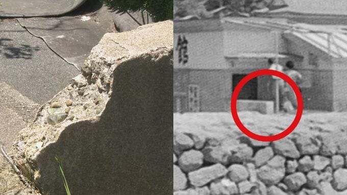 当時の写真を見ると、建物の入り口部分にコンクリートの仕切りのようなものがあり、それと思われるものが今も残っていました。