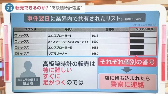 こうしたリストは今回のような事件が起きると業界内で共有されるようになっていて、宝石広場 渋谷本店の担当者は「高級腕時計の転売は特に難しい。すぐに足がつくのでは」と言います。