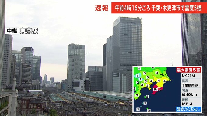 交通に関する情報です。JR東日本によりますと、都内を走る各路線についてはこの地震による影響はいまのところ、出ていないということです。また、千葉県内については現在調査中としています。