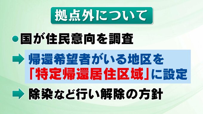 9割以上残る拠点外について、国は住民の意向を調査し、帰還を希望する住民がいる地区について、新たに「特定帰還居住区域」を設定し、除染などを行って、避難指示を解除する方針で、関連法案が今国会で審議されています。