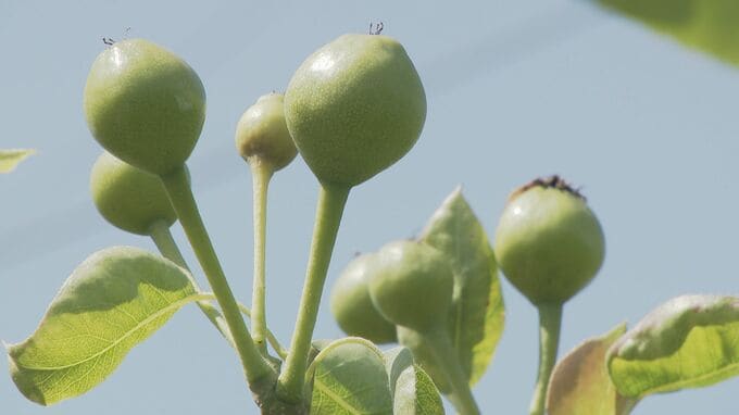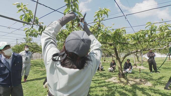 「ナシ」は、一つの房に7つ前後の実をつけますが、大きく形の良い実を収穫するためにはまだ実が小さい5月頃に一個だけ実を残し、他は切り落とす作業=摘果を行う必要があります。