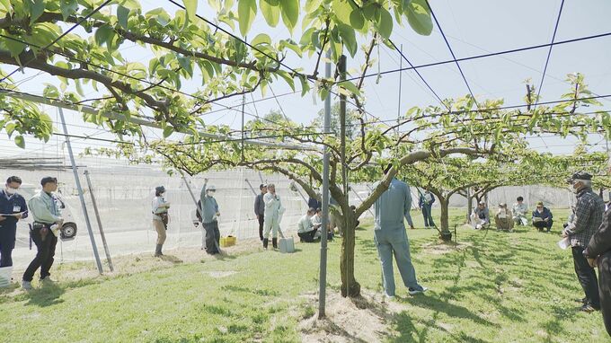 生産農家は、試験場の研究員から上を向いている実は、今後、軸が折れやすくなるため落とした方が良いなど摘果作業のポイントについて指導を受けていました。