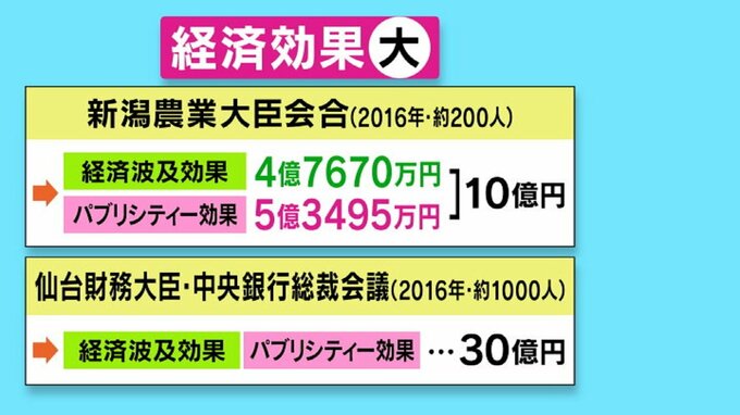 2016年に新潟で開かれた『農業大臣会合』の時には、経済波及効果が4億7670万円、広告料などのパブリシティー効果が5億3495万円、合わせて10億円となったといいます。