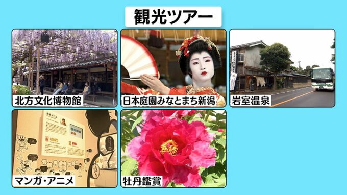 古町芸妓やかつての豪農文化を体験できるコースや、温泉やマンガ・アニメなどのカルチャーを巡るコース、その他にも、見頃を迎えたボタンの花と日本酒の酒蔵を巡るコースが用意されました。