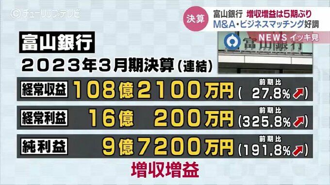 富山銀行の2023年3月期・連結決算は、売上高にあたる経常収益が108億2100万円で3期ぶりの増収、経常利益は新型コロナの影響を見越した引き当てなどで減少していた前期から300%以上伸び、4期ぶりの増益となりました。