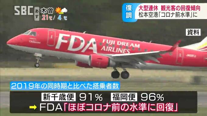 FDA=フジドリームエアラインズによりますと、松本空港を発着する路線の4月29日から5月7日までの搭乗率は全体で80.6パーセントで、2022年を8ポイント余り上回りました。
