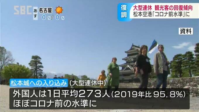 一方、松本市によりますと、連休中に松本城を訪れた人は、1日平均およそ4.400人で、2019年の6割程度に回復しました。