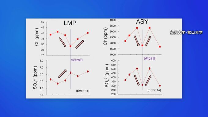 研究グループは去年から、珠洲市周辺の5つの地点で温泉水のイオン濃度などを分析していて、地殻変動が活発になった去年9月下旬ごろには、濃度に変化がみられました。
