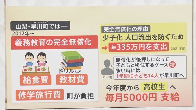 そして山梨県・早川町では2012年から小中学生の義務教育の“完全無償化”が行われています。