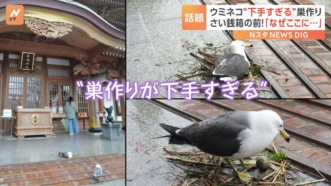 青森にある国内有数のウミネコの繁殖地で、あるウミネコの巣作りが“下手すぎる!”と話題になっています。