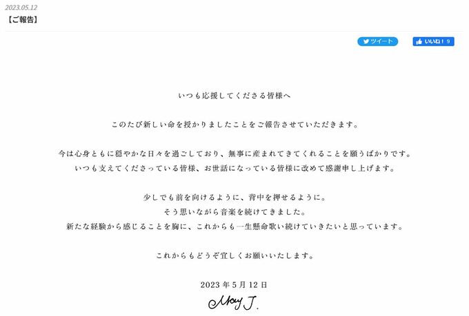歌手のMay J.さんが第1子妊娠を公式サイトで報告し、「今は心身ともに穏やかな日々を過ごしており、無事に産まれてきてくれることを願うばかりです。」と心境を明かしています。