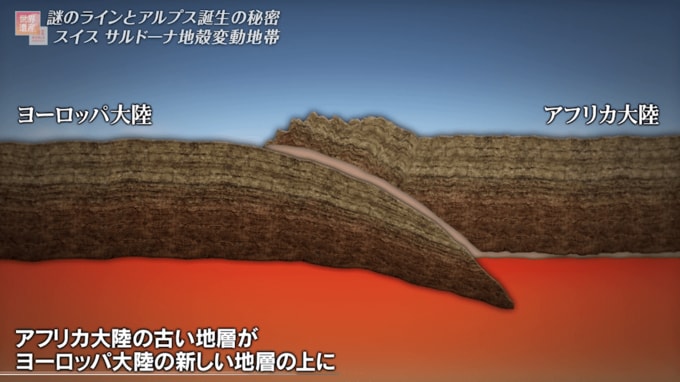 有史以前、まずアフリカ大陸とヨーロッパ大陸が南北から移動してきて衝突。そのときに一部の地域で、アフリカ大陸の古い地層が、ヨーロッパ大陸の新しい地層に乗り上げます。
