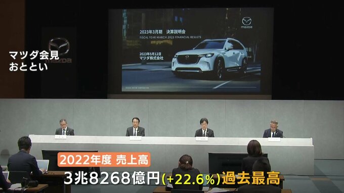 マツダは、昨年度の決算を発表し、円安の影響などで売上高は過去最高を更新して増収増益となりました。マツダによりますと、2022年度の売上高は3兆8268億円で、前の年を22.6%上回り、過去最高となりました。世界販…