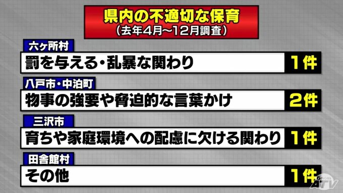 暴力など乱暴な関わりや家庭環境への配慮に欠ける関わりといった不適切な保育。国が全国の保育所を対象に初めて行った調査で900件以上、青森県内でも5件が確認されました。国が虐待に関するガイドラインを示す中、…