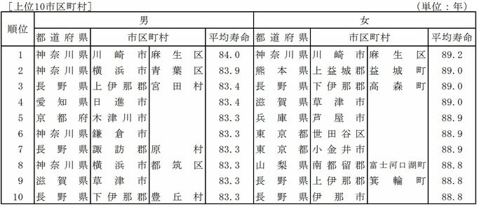 市町村別では、神奈川県川崎市麻生区が男女ともに1位となっています。