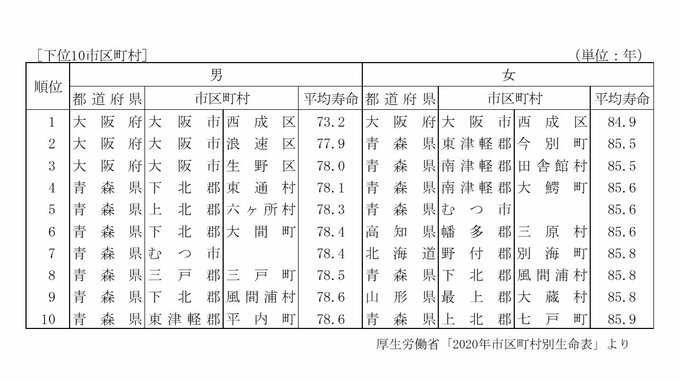一方、平均寿命が短いのは大阪市西成区で、女性が84.9年、男性が73.2年でした。