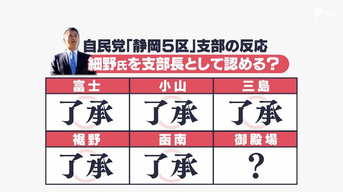 吉川赳衆議院議員が自民党を離党して支部長不在のままの静岡5区をめぐって自民党静岡県連の富士支部など5つの支部は5月15日までに、細野豪志衆議院議員を支部長とする県連の案について了承しました。残る御殿場の…