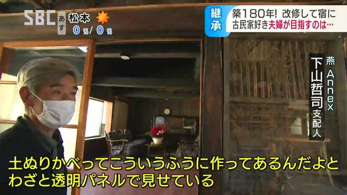 ■信州古民家の宿燕(えん)Annex(アネックス)(別館)下山哲司(しもやま・てつじ)支配人 「昔は全部、土塗り壁。新たに壁にするともったいないので一番目につくところに土塗り壁こういう風に作ってあるんだよとわざと透明パネルで見せている」