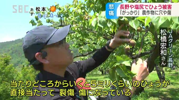 ■JAグリーン長野営農指導課 松橋宏和(まつはし・ひろかず)主任調査官  「当たり所からいくと5ミリくらいのひょうが直接当たって、裂傷、傷になっている」