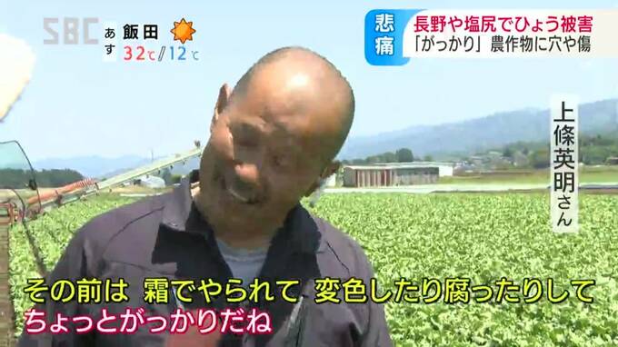 片丘地区の農家・上條英明(かみじょう・ひであき)さんは、4ヘクタールの畑でレタスなどの葉物野菜を作っていますが、生育途中の葉にはひょうが貫通した穴が開いていました。