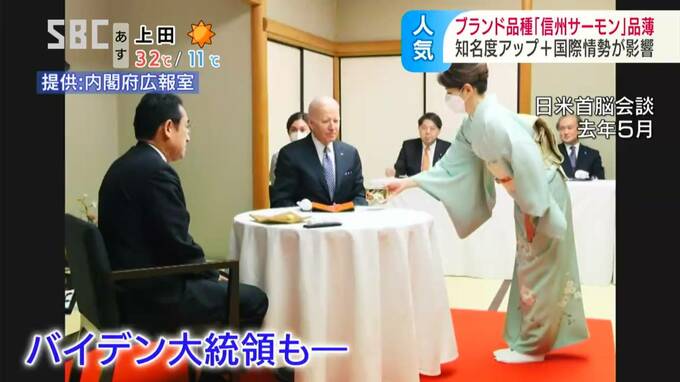 信州サーモンは、2022年の日米首脳会談でアメリカのバイデン大統領にふるまわれたほか、4月に軽井沢町で行われたG7外相会合のワーキングディナーでも握りずしとして提供。