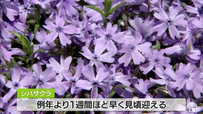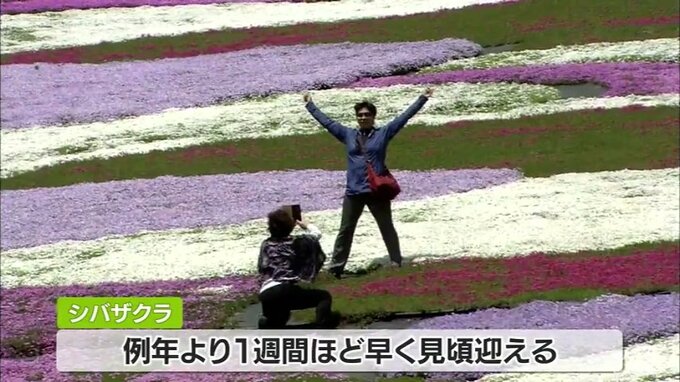 十和田市によりますと、ことしは暖かい日が続いたためいつもの年より1週間ほど早く見頃を迎えているということで、連日、大勢の観光客が訪れ花の絨毯の中を歩いています。