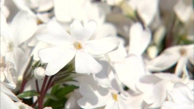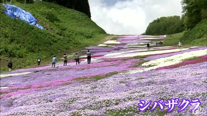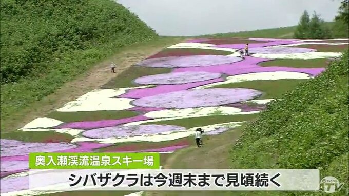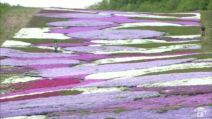 斜面に咲き誇るのは、紫やピンク、白などのシバザクラです。十和田市の奥入瀬渓流温泉スキー場の幅30メートル長さ260メートルのゲレンデを覆うように、約7万2000株のシバザクラが鮮やかに色づいています。