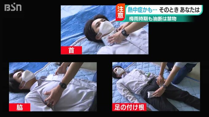 まず、熱中症を疑う人を見つけたら反応を確認。反応がない場合や、意識があっても言動がおかしい場合はすぐに救急車を呼んでほしいということです。