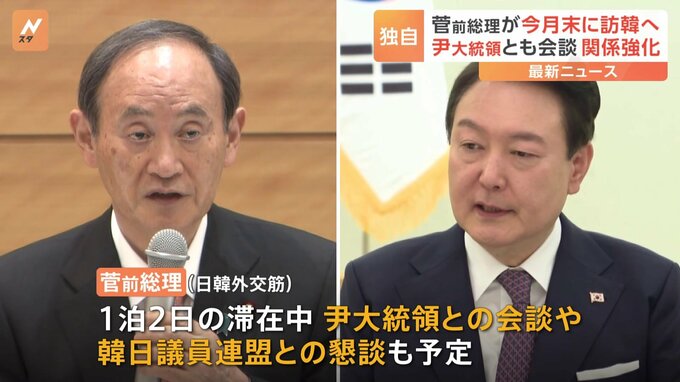 日韓議員連盟会長の菅前総理が、今月30日に韓国を訪問する方向で調整していることがJNNの取材で分かりました。議連会長に就任後、菅氏が韓国を訪れるのは初めてで、日韓外交筋によりますと、1泊2日の滞在中、尹錫…