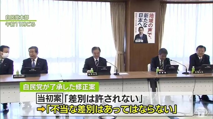 自民党総務会は16日午前、「LGBT理解増進法案」の修正案を全会一致で了承しました。自民党内では反対論が強かったことから2021年に超党派の議員連盟がまとめた「差別は許されない」との表現は「不当な差別はあってはならない」「性自認」は「性同一性」に修正されました。