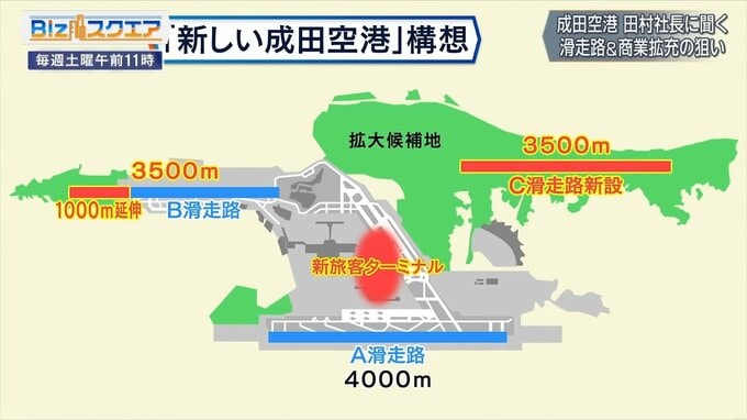成田国際空港会社は2023年3月、B滑走路を1000m延ばすことや、3500mあるC滑走路の新設など、現在三つあるターミナルを一つにまとめた1ターミナル化の具体的な構想を明らかにした。滑走路の整備は2029年3月末を目指して進められている。