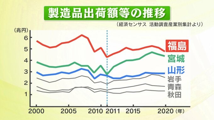 6つの折れ線グラフは東北6県それぞれの数字で、福島県は、確認できた昭和45年以降これまで50年以上にわたって「東北トップ」の座を守ってきました。2位の宮城県との差は徐々に縮まってはいますが、福島県は「ものづくり」が盛んな県だということがわかります。