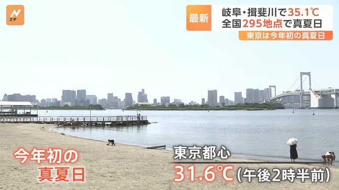午後2時半前に31.6℃を観測し、今年初めて30℃を超える真夏日となった東京都心。お台場では、海水浴やピクニックを楽しむ人の姿が多く見られました。「じりじりしてめちゃくちゃ暑いです。今年の夏どうなるんだろ…