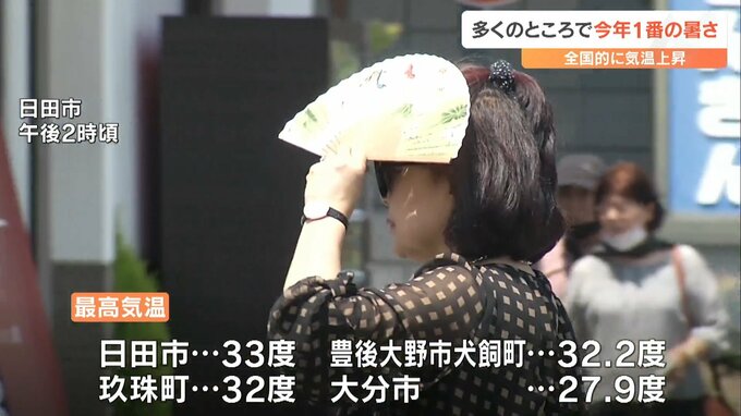 全国的に季節外れの暑さに。大分県内でも各地で最高気温が30度を超え、多くのところで今年1番の暑さとなりました。県内は17日も南からの高気圧に覆われて午前中から各地で気温が上昇。日中の最高気温は日田市で33…