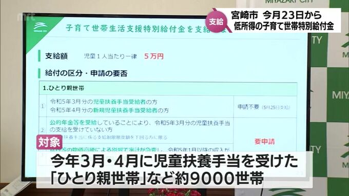 物価高騰などの生活支援策として、宮崎市は低所得の子育て世帯への特別給付金を今月23日から支給を開始すると発表しました。これは、国の交付金を活用して支給するもので、宮崎市内での対象は、今年3月と4月に児童…