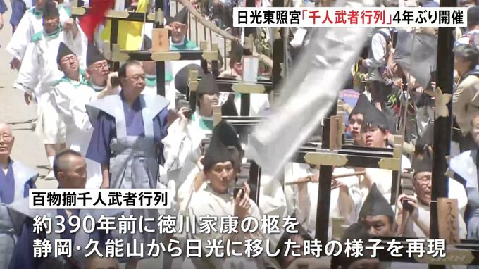 4年ぶりの練り歩きです。栃木県の日光東照宮では、新型コロナの影響で中止されきた「千人武者行列」が4年ぶりに行われました。伝統行事「百物揃千人武者行列」は、およそ390年前に徳川家康の柩を静岡県の久能山か…