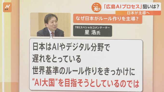そこで今回の議長国の日本が“国際ルール作り”の議論を主導しようということなんです。岸田総理は、AI活用の国際ルールなどを盛り込んだ「広島AIプロセス」をサミットで打ち出す方針です。そして“初の国際ルール作り”を目指します。そもそも、なぜ日本がAIのルール作りを主導しようとするのか、TBSスペシャルコメンテーターの星浩さんに伺いました。